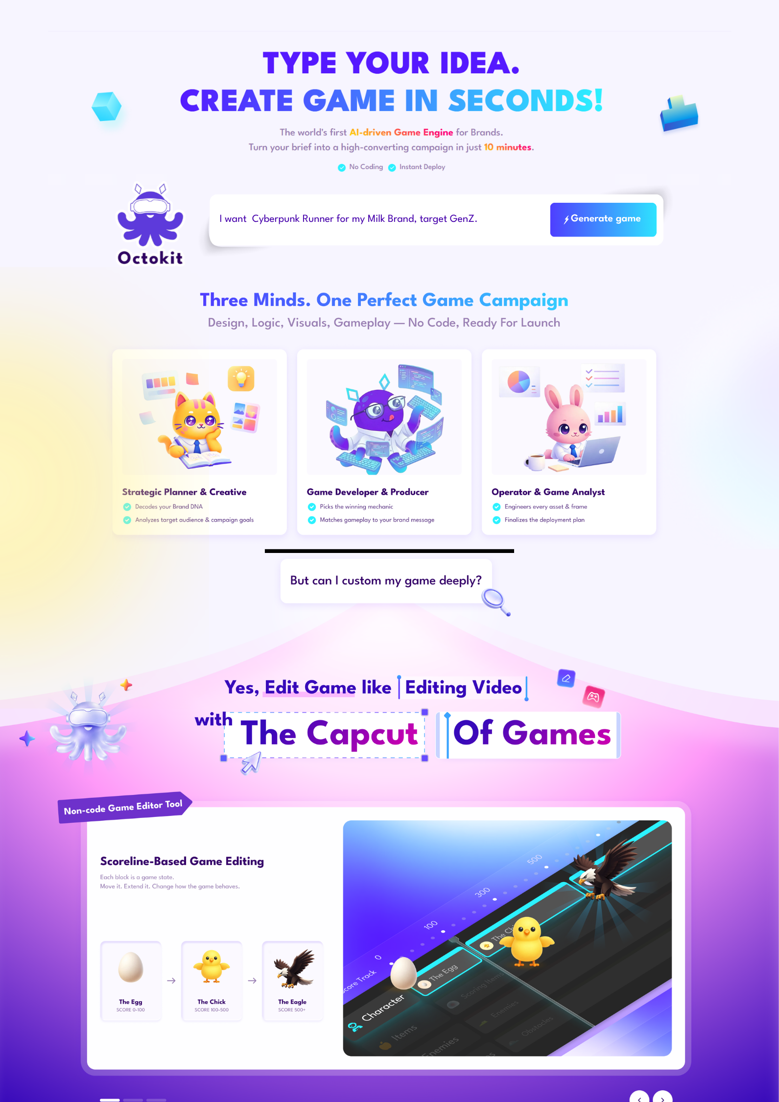Start with a simple text prompt. Using OctoAI—the world’s first Text-to-Game AI — you can generate your entire game foundation in seconds. Just type your campaign goals and brand messages. The AI instantly handles the heavy lifting, drafting your characters, environments, and basic scoring logic.
