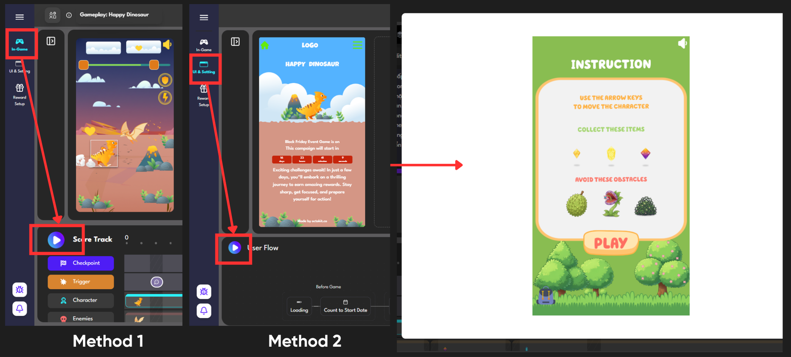 Use the Preview Button appear at the bottom panel to check out your Gameplay.